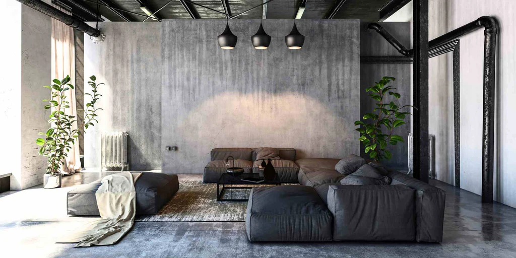 To prevent spaces from feeling cold, combine concrete with wood textures and soft furnishings.